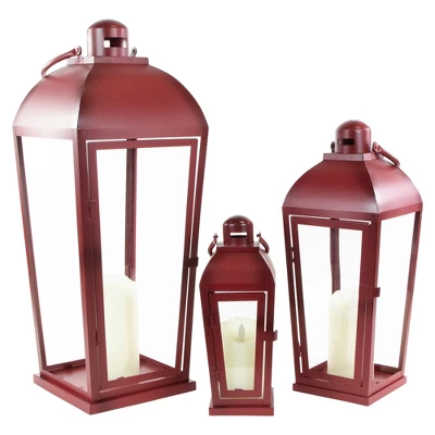 Lanterns accent any decor style from traditional to contemporary. Place a candle inside to create a cozy atmosphere. The perfect addition to bookshelves, mantle places, porches, or tables. The ring at the top can be used to hang the lantern. The sleek metal and glass are a great way to add a timeless chic touch to your living space or a unique touch to holiday decor.Product Features:Set of 3 red antique style candle lanternsHinged doors for easy accessEach lantern can hold (1) candle – not includedRing at the top allows you to hang the lanternRecommended for indoor use only – if using outdoors place in a covered areaDimensions:Large Lantern: 23.5″H x 9″W x 9″DMedium Lantern: 17.25″H x 6.5″W x 6.5″DSmall Lantern: 11.75″H x 4.25″W x 4.25″DMaterial(s): metal/glass